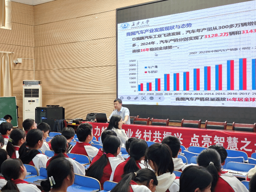 座谈会同时,“交通运输团”代表成员前往商南县鹿城中学开展“助力特色产业乡村共振兴,点亮智慧之光科普强国行动”活动。汽车学院陈轶嵩教授、王飞老师分别作“汽车强国 科技报国”“智能汽车技术概论”科普讲座,并向鹿城中学捐赠图书。